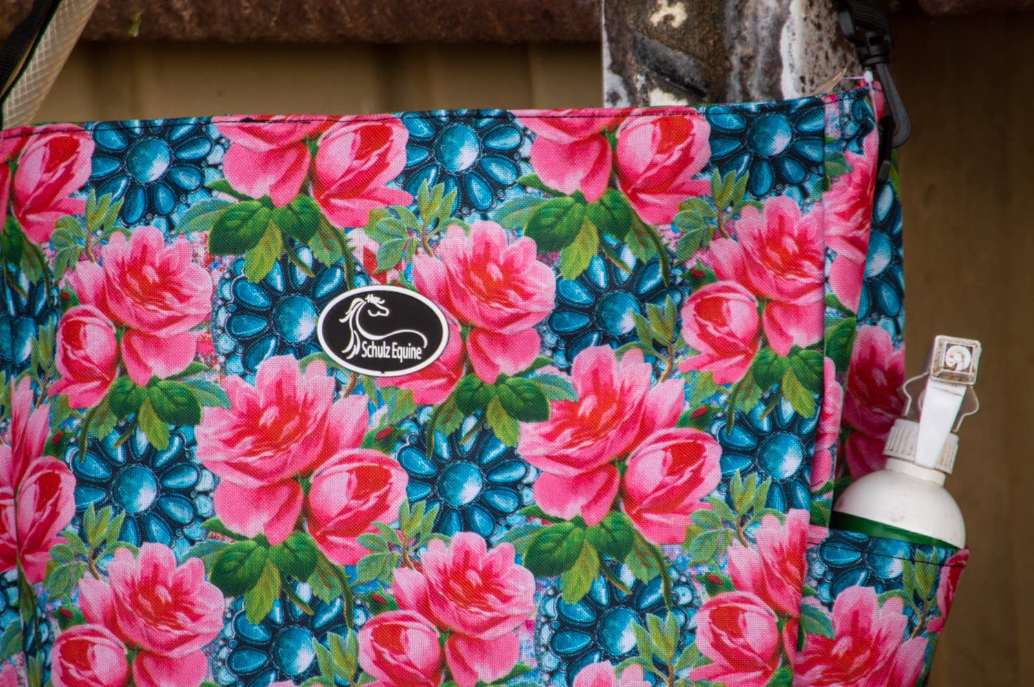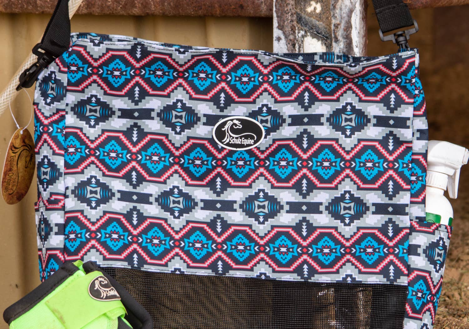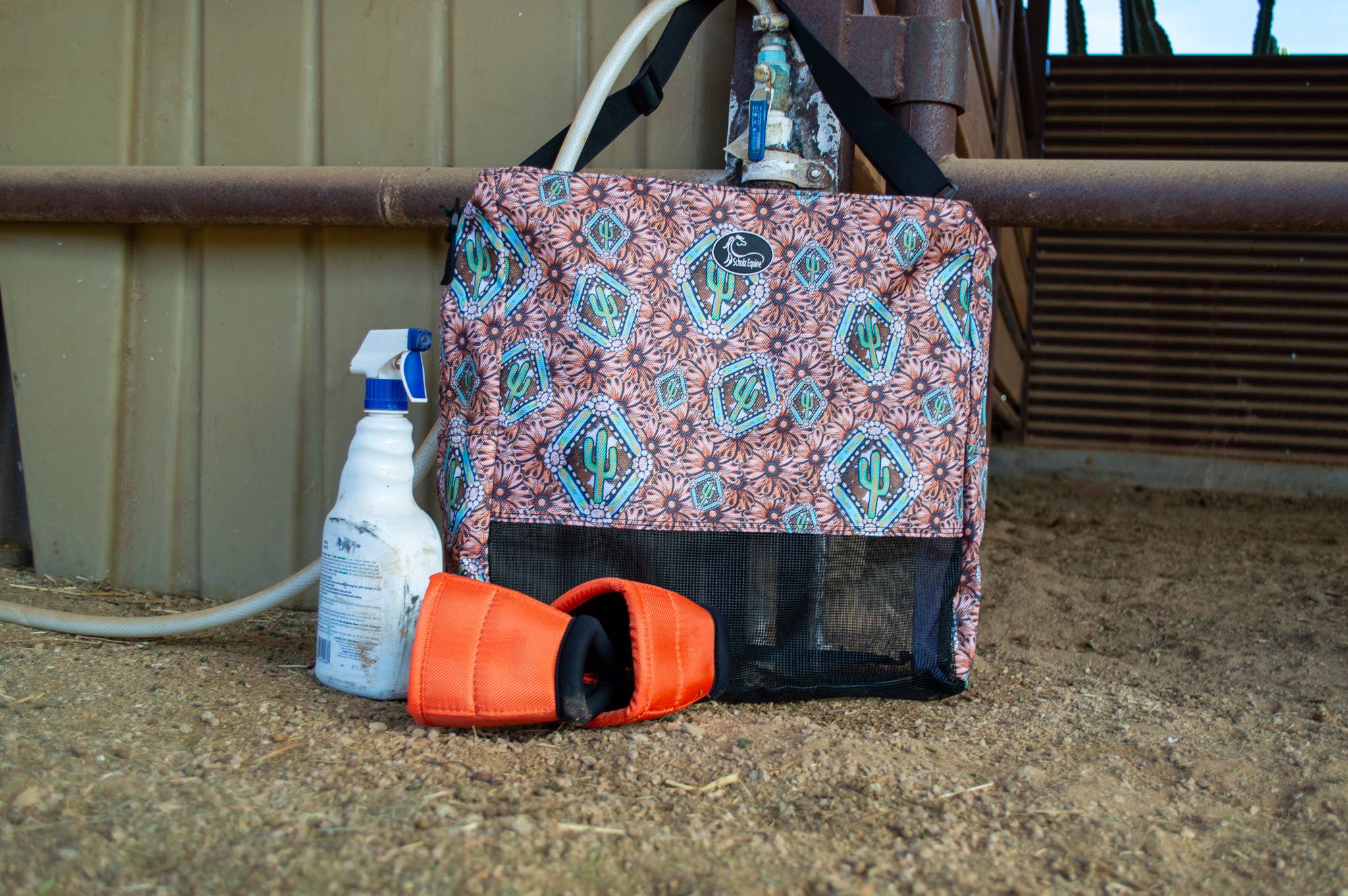 The Everything Equine tote bag serves as a versatile solution for all equine enthusiasts. With 6 vibrant prints to choose from, this bag is ideal for storing leg protection boots or grooming supplies. The mesh sides and bottoms allow for easy cleanup by letting dirt fall through. Additionally, the bag features 2 exterior pockets, spacious enough for grooming product bottles or water bottles. It also includes a zipper top for secure containment, as well as a detachable shoulder strap for effortless transport and attachment to stalls or trailers while grooming. Measuring 16" across, 15.5" tall, and 6" wide, this tote bag is designed to meet all your equine needs.